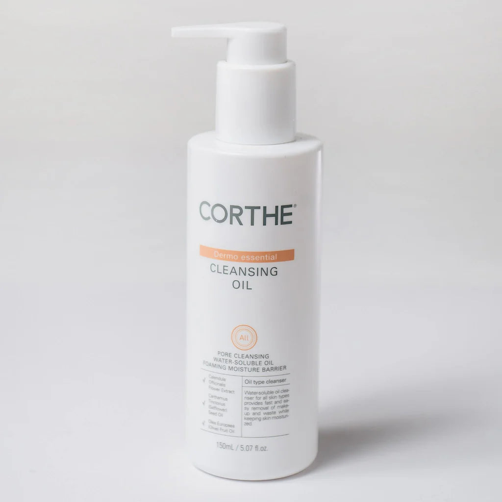 Corthe Dermo Essential Cleansing Oil is a water-soluble botanical cleansing oil designed to safely and effectively cleanse the skin and remove impurities such as excess sebum and makeup. It is a mild, non-irritating oil designed to provide a gentle, deep cleanse that won't strip moisture from the skin.