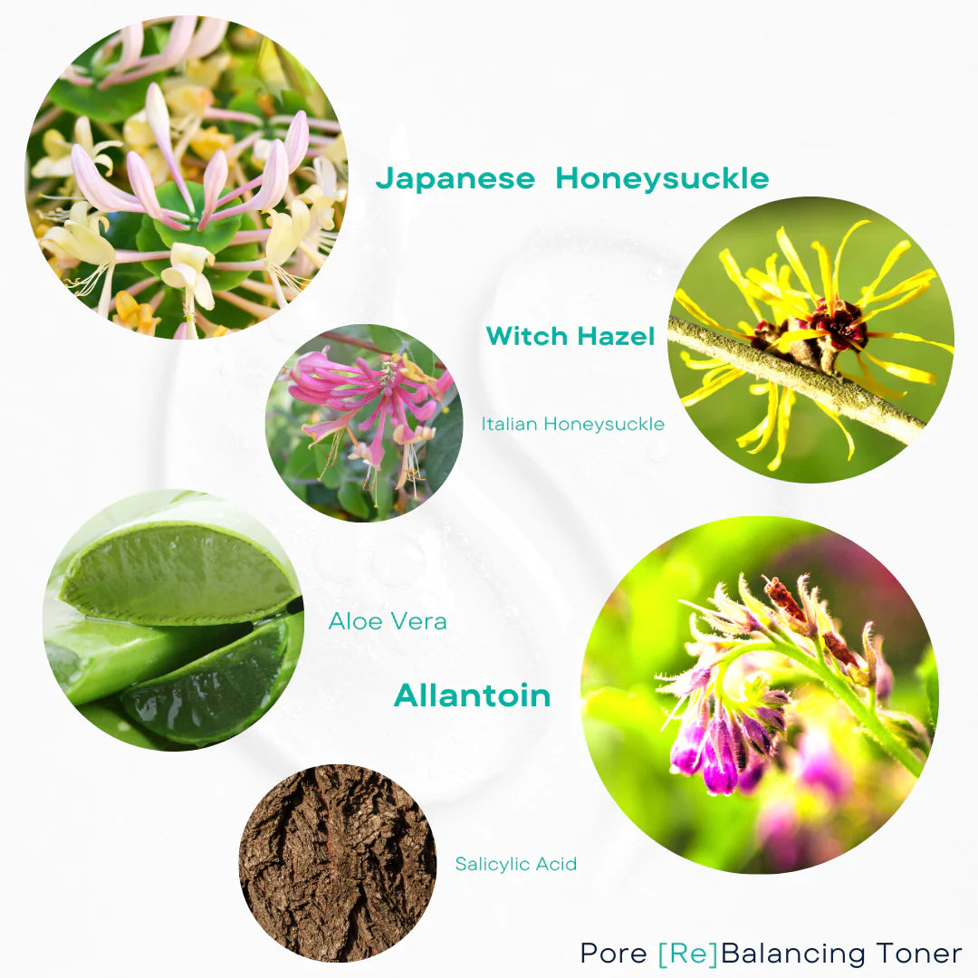 Aqua, Hamamelis Virginiana (Witch Hazel), Glycerin (Vegetable Derived), Salicylic Acid (Willow Bark), Totarol (Totara Tree), Allantoin (Comfrey Root), Niacinamide (Vitamin B3) Aloe Barbadensis Leaf Juice Powder*, Biotin (D)(Plant Derived), Pyridoxine HCl (Vitamin B6), Hydrolyzed Yeast Protein (Microbiome Support), Lonicera Japonica (Japanese Honeysuckle) Flower Extract, Lonicera Caprifolium (Italian Honeysuckle) Flower Extract, Panthenol (D)(Vitamin B5), Potassium Sorbate, Alcohol Denat*, Citric Acid