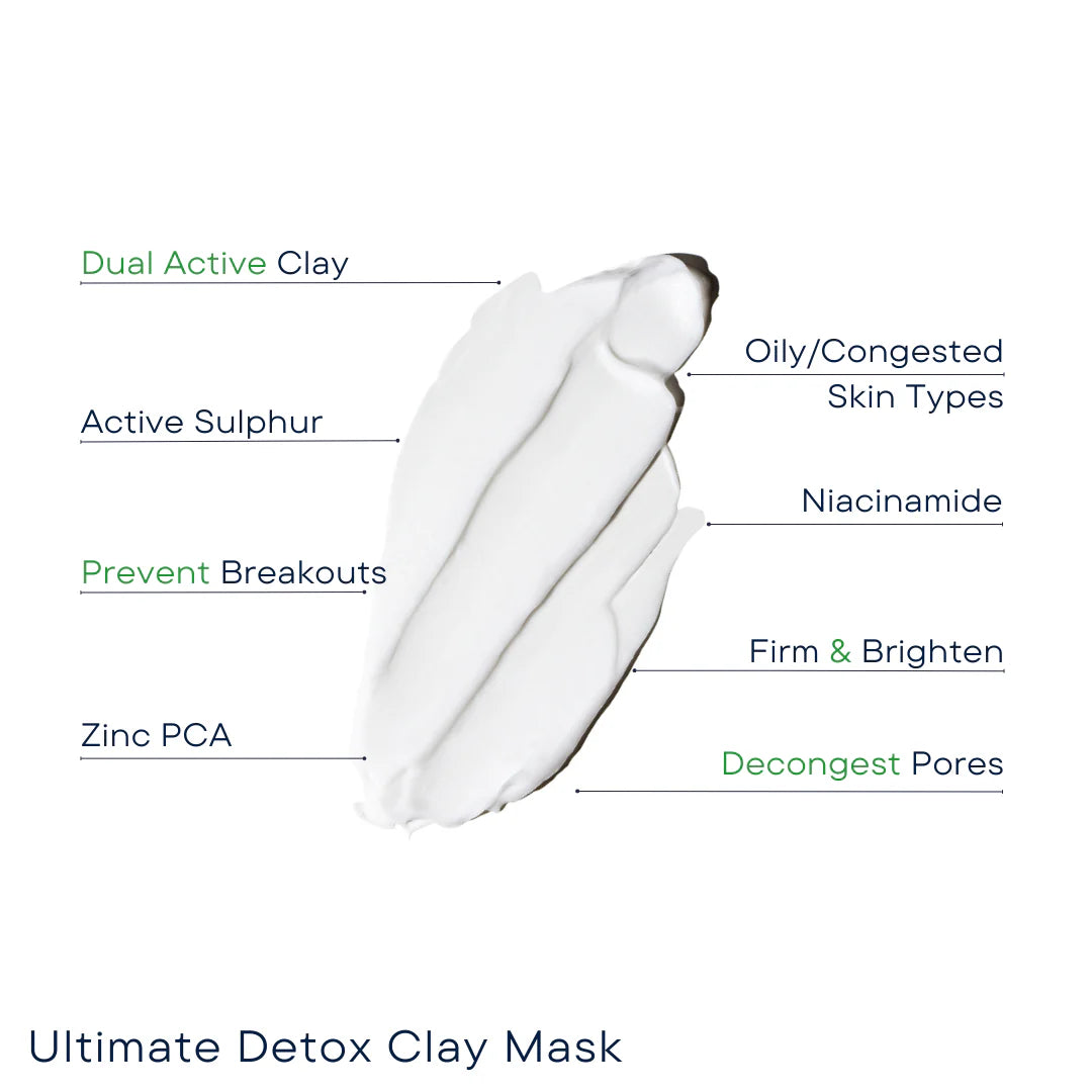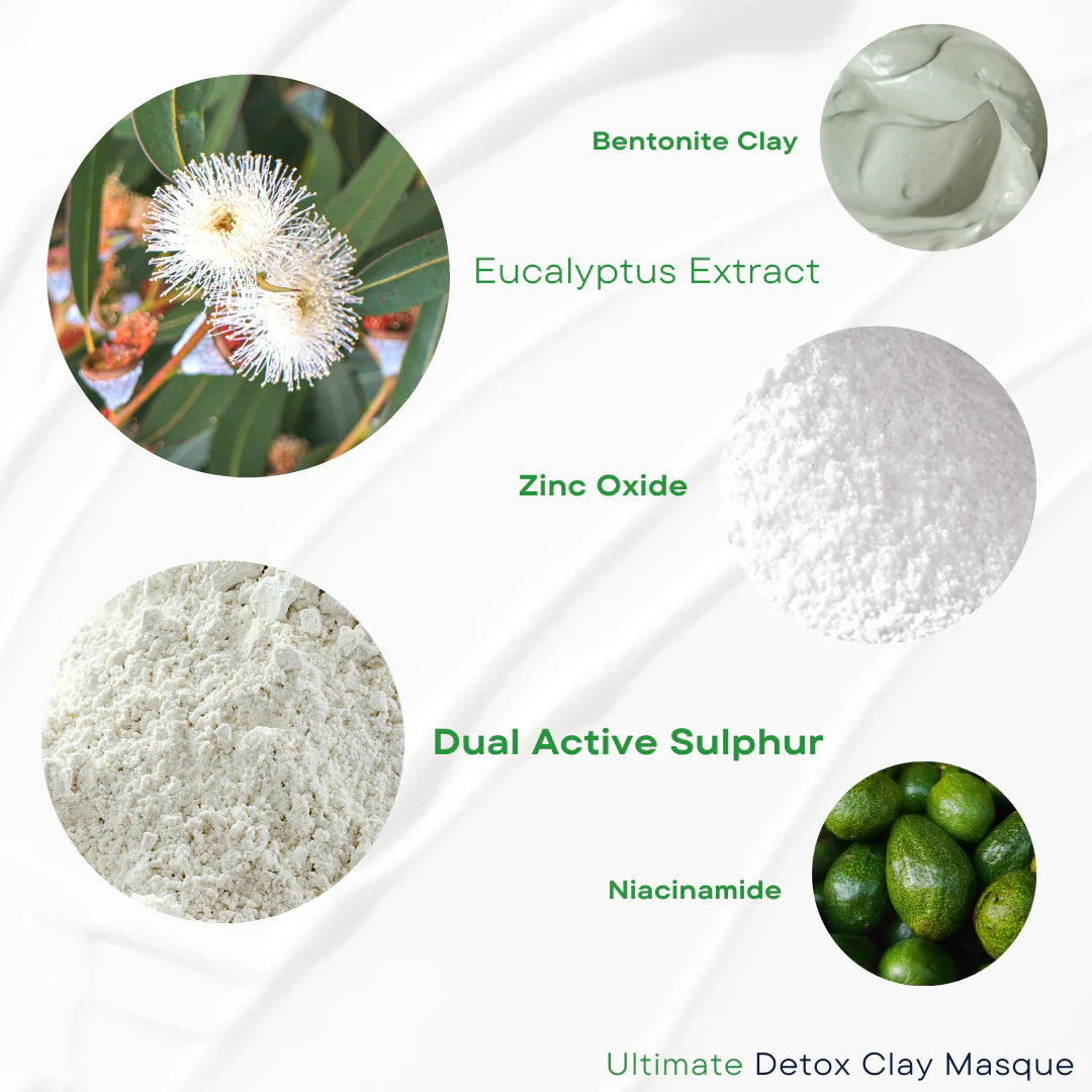 Sulphur – Sulfur is naturally occurring often found in volcanic areas. Sulfur works to penetrate pores and clear up breakouts while preventing new breakouts from forming. The Ultimate Detox Mask features a clinical grade Sulphur blend with maximum-strength benefits that clear acne while absorbing excess dirt and oil.